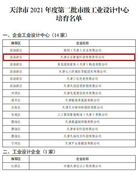 近日,天津市工业和信息化局下发了《天津市2021年度第二批市级工业设计中心培育名单的公示》,根据《国家级工业设计中心认定管理办法(试行)》,经企业申报、主管部门推荐、专家评审、公示等过程,天津云圣智能科技有限责任公司(以下简称云圣智能)等14家企业被认定为市级工业设计中心。