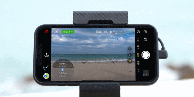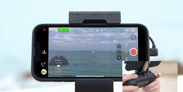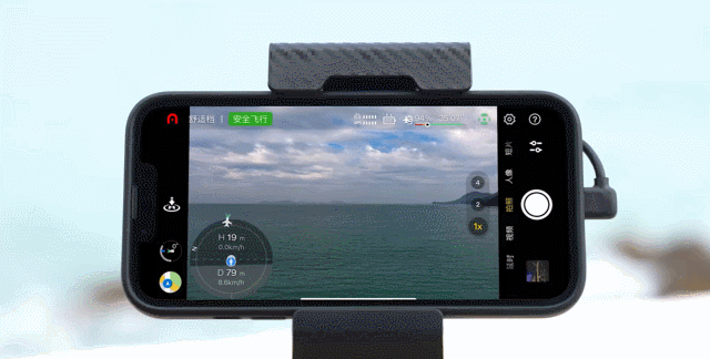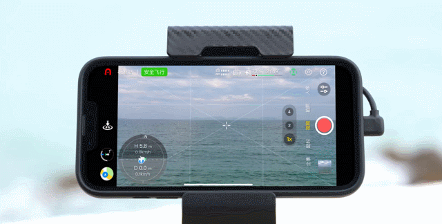 飞行时,在App图传界面的左下方通过姿态球可实时查看飞行器相关信息,将遥控器正对姿态球上的飞机图标,可使图传质量达到最佳状态。