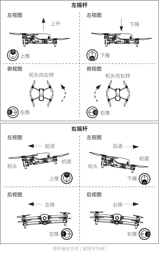 以默认的美国手为例,飞行时,左摇杆负责控制飞行器高度与机头朝向,右摇杆负责控制飞行器前进、后退以及左右飞行。