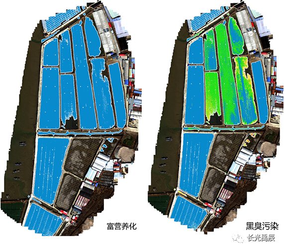 AQ600 Pro视频多光谱相机在视频模式下也会同步保存16bit的原始TIFF格式多光谱图片,利用同步获取的该养殖区内航飞多光谱影像,将内业数据处理的结果与视频模式下的反演结果进行对比,二者对于富营养化与黑臭污染的反演结果完全吻合。