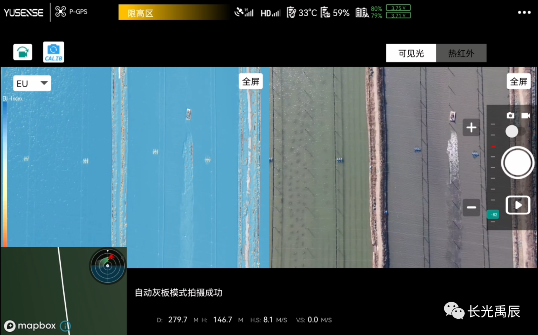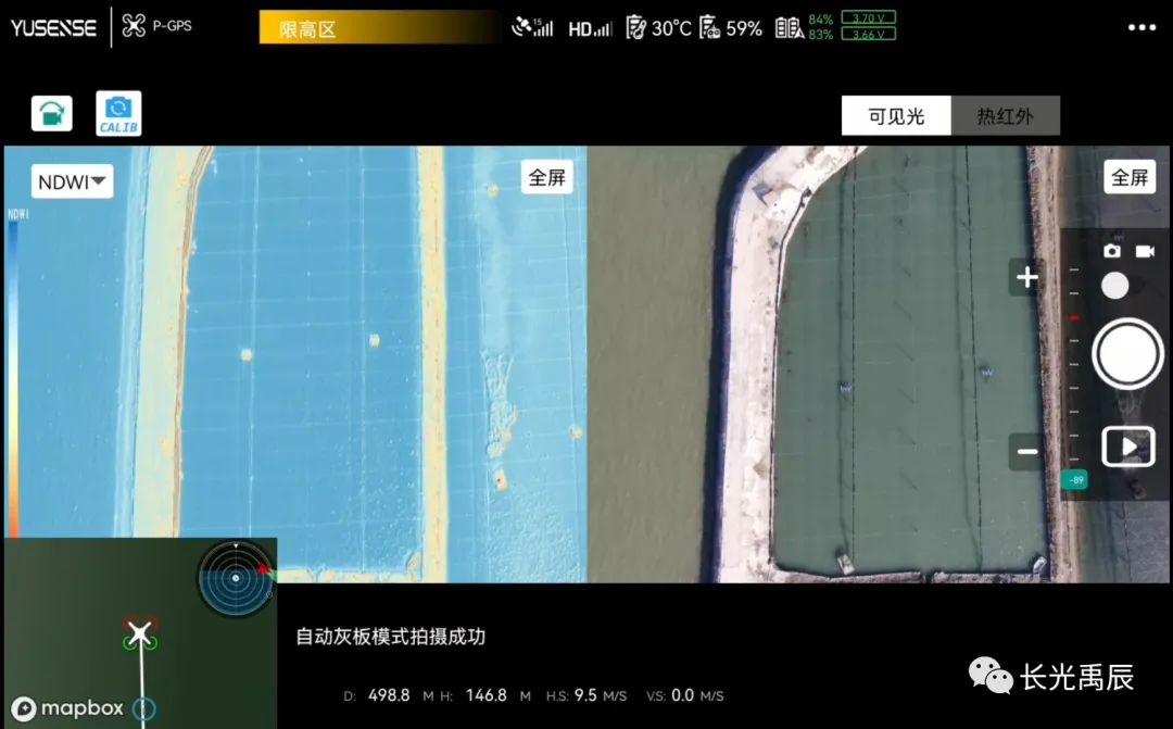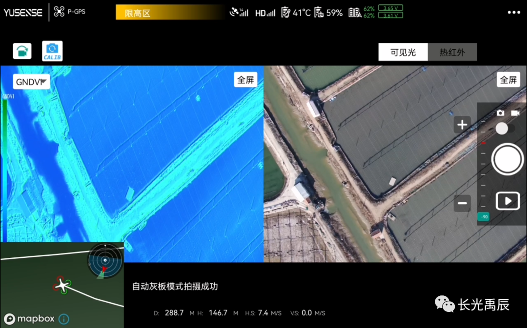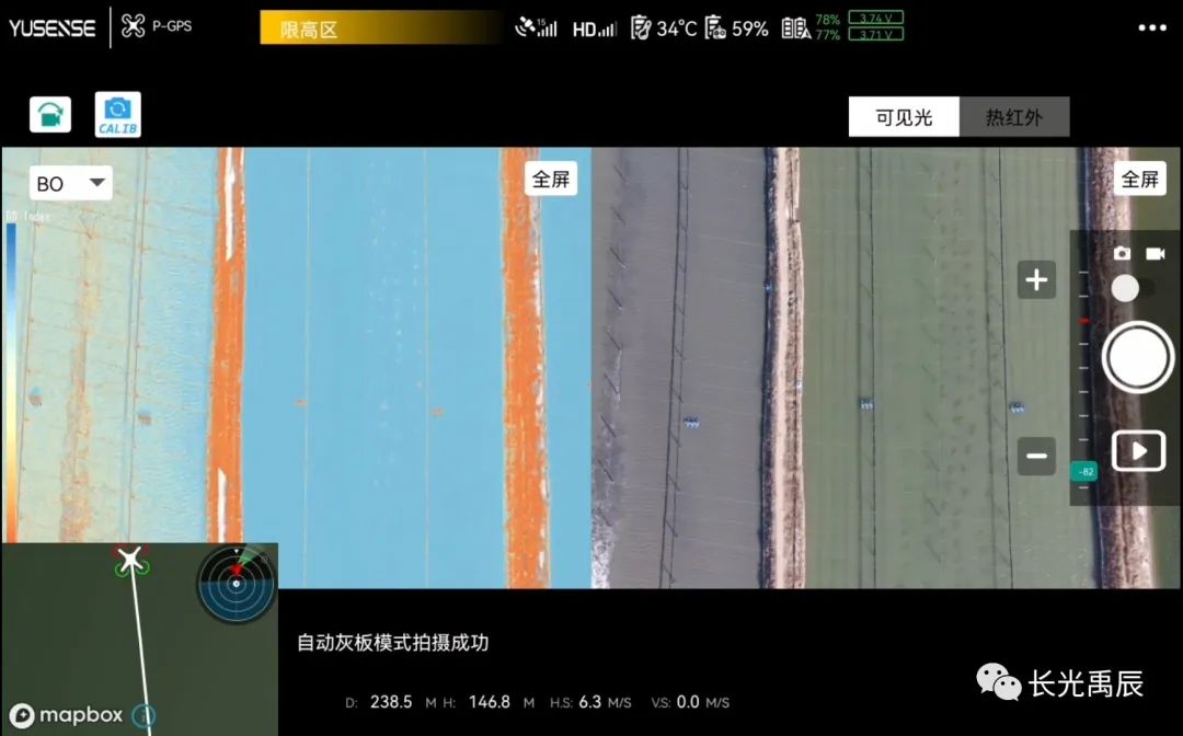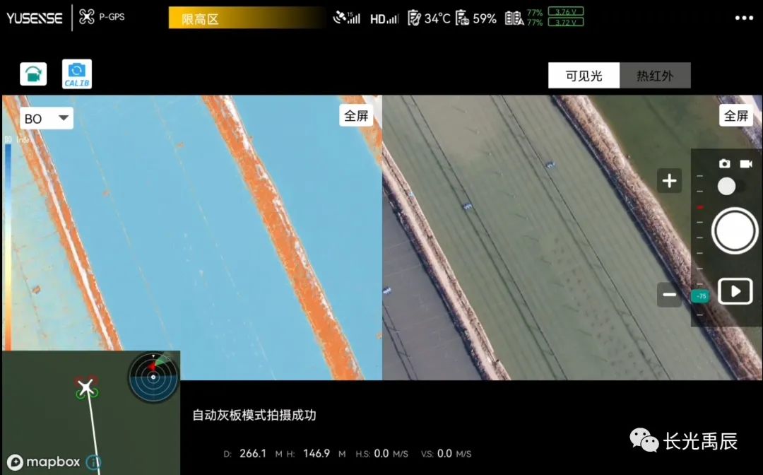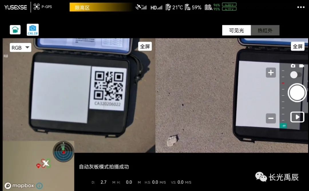打开Yusense Fly软件,进入“视频模式”,默认显示多光谱的RGB镜头与H20T的可见光影像,使用“自动灰板识别”功能进行多光谱相机标定,保证反演结果的准确性。