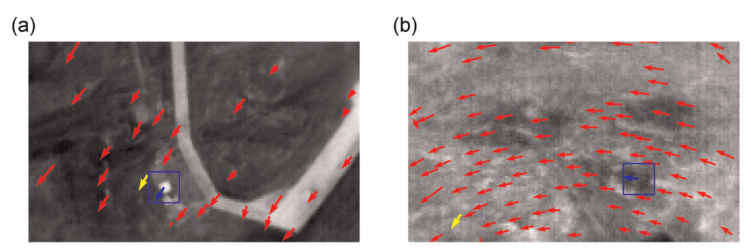 图7 从海拔 400m 处获取的图像中获得的示例图像和产生的流场。(a) 包含跑道和小型基础设施的图像,带有特征运动的颤动图。(b) 仅带有颤动图的自然场景图像。自然场景具有更多识别跟踪的特征
