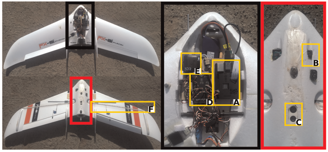 图4 实验飞机(左上)和底部(左下)的图像,顶部(中)和底部插图(右)。布局包括 (A) Raspberry Pi 嵌入式计算机,(B)LWIR 传感器,(C)PX4FLOW,(D)Pixhawk 自动驾驶仪,(E) 3DR 指南针和 UBlox GPS 模块,以及 (F)机翼照明