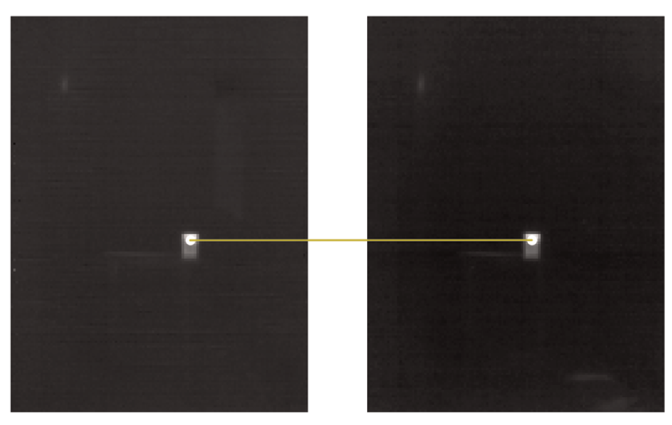在飞行前,TF方法的经验评估如下进行。LWIR传感器针对由实验室内的环境条件设定的强度大致均匀的场景。通过将玻璃圆筒加热到环境温度以上产生的“热”标记被放置在距离传感器已知范围(2.0 m)的场景中。然后标记垂直于传感器视图移动已知距离(0.078 m)。在之前和之后的条件下都捕获了LWIR 帧。范围和距离的受控值允许对热标记特征的位移角进行数值计算。对两个框架进行热流处理以确定角位移。图3显示处理后的帧。
