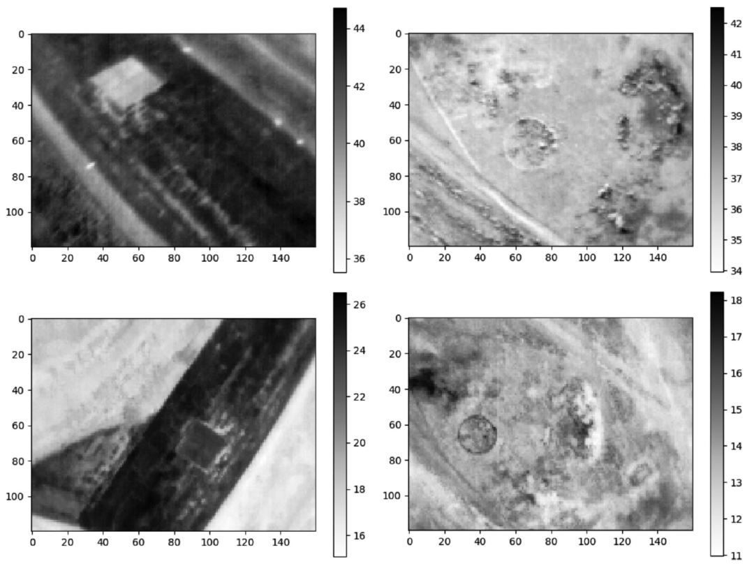 图1 长波红外 (LWIR) 传感器处理后的热图像。跑道(左上)和地形(右上)的白天LWIR图像。跑道(左下)和地形(右下)的夜间图像。灰度彩条为其相邻图像提供以摄氏度为单位的表面温度