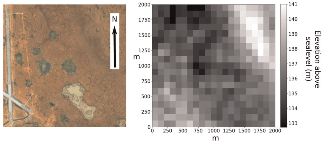 实验是在位于南澳大利亚的一个现场进行的。选择该站点是因为它允许进行无人系统实验,包括无人机的夜间操作。在地理上,该地点是一个干旱地带景观,具有稀疏的膝盖高度的自然植被和起伏的地形。由于地处偏远,操作区域内的人工特征极少。该地点在春季和夜间都在白天和夜间使用,风力适宜,但其他情况下则晴朗温和。图6显示该站点的卫星视图和海拔地图。该场地位于已获准使用的封闭跑道附近。在实验期间,卫星地图上所有明显的河床都是干涸的。这种环境的海拔高度相当平坦,变化大约十米,确保在任何方向的飞行过程中,地面以上的高度随时间缓慢变化。