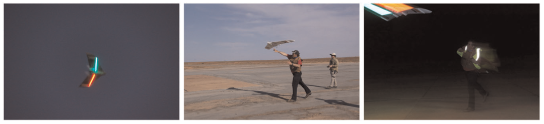 图5 白天(左)、夜间(中)和夜间开灯飞行中的实验飞机(右)