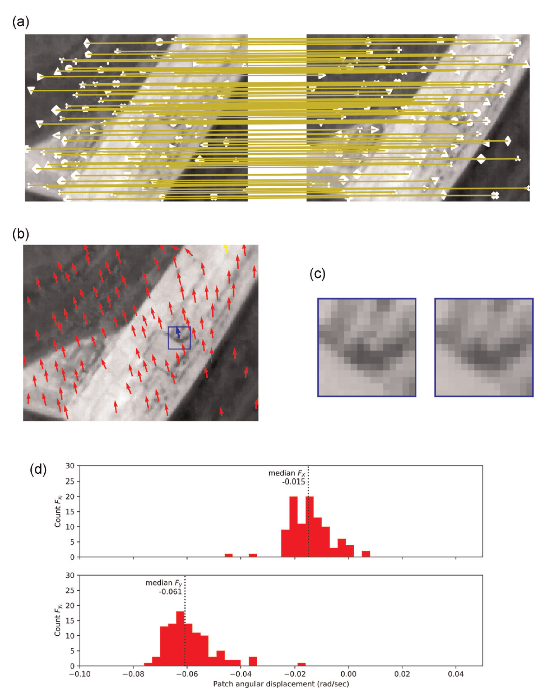 图2 长波红外传感器夜间流动处理。(a) 连续图像之间的关键点匹配。(b) 初始帧中良好特征的位移到后续图像中匹配位置的箭袋图(红色箭头)。使用的最佳(蓝色)和最差(黄色)特征用彩色箭头标注。(c)(左)初始帧中的最佳特征补丁(如(b)中注释);(右)后续帧中的匹配补丁。(d) 关键点的X和Y角位移集的直方图。