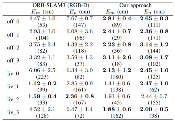 video1因为使用SLAM算法可以构建全局地图,而目标位置可从地图中获得,因此我们将两种算法进行了比较,统计如图4所示,其中Em表示观测到目标时的目标定位误差,Eu表示没有观测到目标时的目标定位误差。可以看出,我们的方法取得了更高的定位精度,因为在SLAM中目标定位精度同时受到相机自身定位精度的影响。比较Em和Eu可以看出,即使不能直接观测到目标,仍能实现其较高的定位精度。