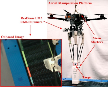 1背景随着无人机技术的逐渐成熟,我们希望赋予无人机更加丰富的作业能力。空中作业机器人便是一种新型的机器人,将无人机与作业机构结合起来,使其兼具无人机的快速空间移动能力和机械臂的精确操纵能力。为了提高机器人的自主作业能力,视觉等传感器往往必不可少。在空中操作机器人中,视觉传感器通常安装在机械臂末端或无人机本体上。视觉传感器安装在机械臂末端时,由于无人机的抖动,作业目标很容易在图像画面中消失;安装在无人机本体上时,作业目标又很容易被机械臂遮挡(如图1所示)。这些问题限制了空中操作机器人进行高精度的作业活动。本文将介绍一种新颖的目标定位方法解决上述问题,相关工作发表于期刊IEEE Robotics and Automation Letters 并将在会议IEEE International Conference on Robotics and Automation (ICRA) 2022上报告[1]。