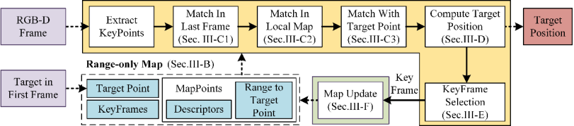 整个定位系统仿照经典的视觉SLAM系统进行搭建,分为建图和定位两部分。建图中,我们仅保存并更新特征点到目标点的距离,并不保存点的三维坐标,该地图被称为target-centered range-only map。定位中,实现的是求解目标点在当前相机坐标系中的相对位置,核心是构建上述的优化方程。