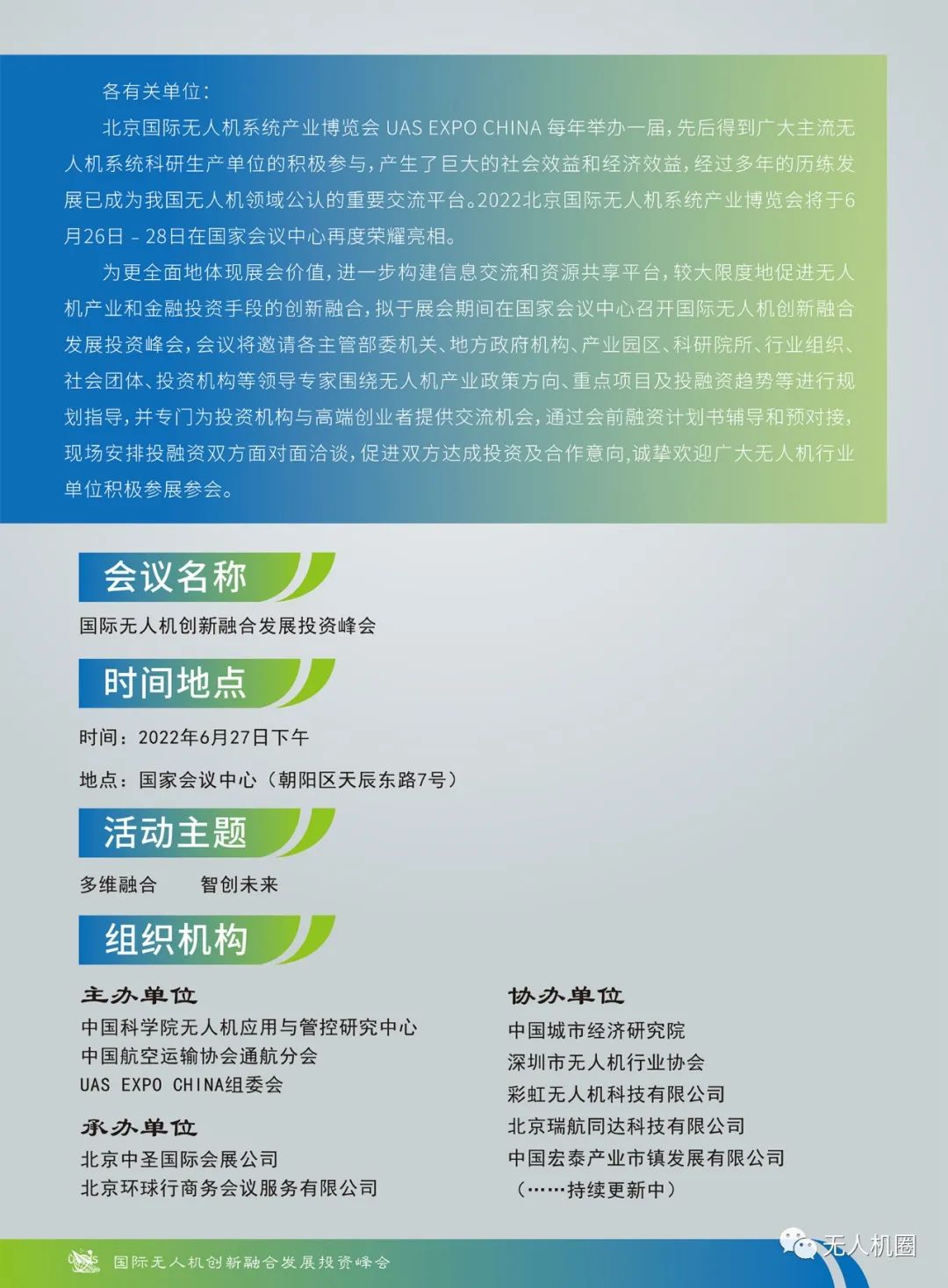 为促进我国无人机产业高质量创新发展,进一步构建无人机行业信息交流和资源共享平台,较大限度地促进无人机产业和金融投资手段的创新融合,以“多维融合、智创未来”为主题,2022国际无人机创新融合发展投资峰会拟于6月27日在北京国家会议中心召开,届时将邀请各主管部委机关、地方政府机构、产业园区、科研院所、行业组织、社会团体、投资机构等领导专家围绕无人机产业政策方向、重点项目及投融资趋势等进行规划指导,并专门为投资机构与高端创业者提供交流机会,通过会前融资计划书辅导和预对接,现场安排投融资双方面对面洽谈,促进双方达成投资及合作意向。