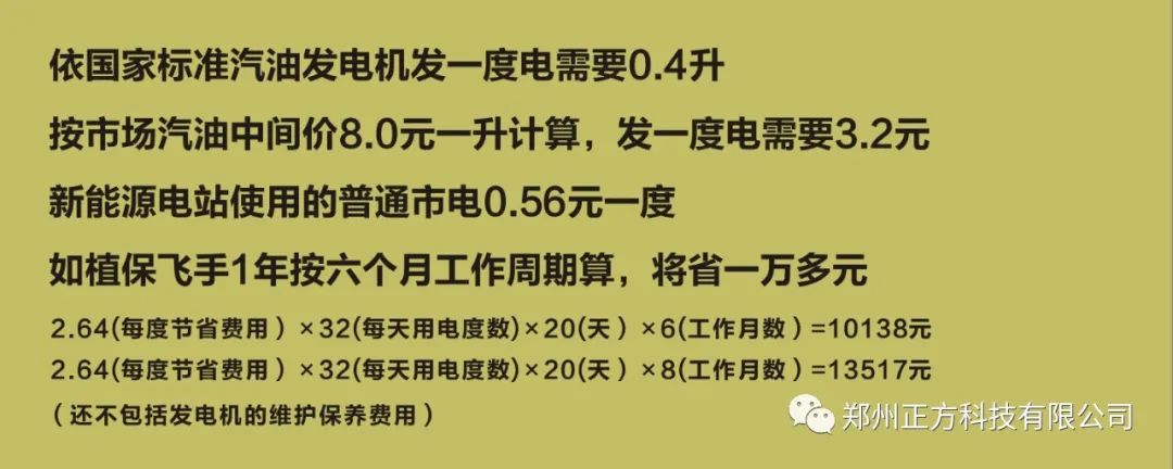 使用成本低:随着燃油成本的节节高攀,低廉的电力成本日渐凸显,依国家标准汽油发电机发一度电需要0.4升,按市场汽油中间价8.0元一升计算,发一度电需要3.2元。而新能源电站使用的普通市电0.56元一度。如植保飞手1年按六个月工作周期算,将省一万多元。