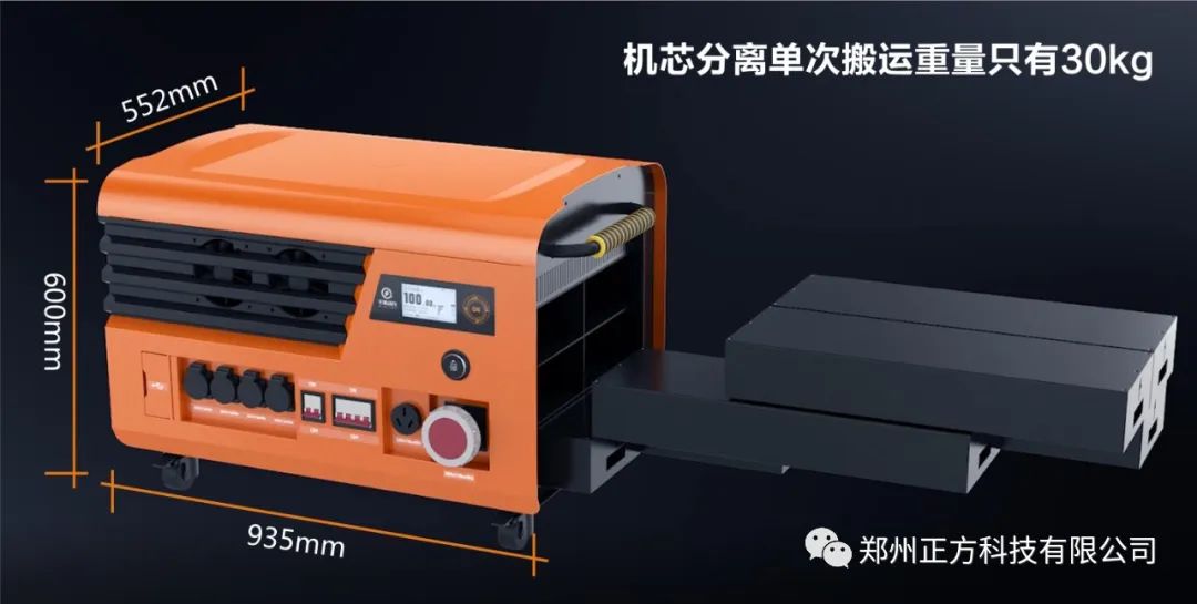 机身和电芯模块进行分离式设计,分为1个机身,6个高能量密度电芯标准模块,同时可以支持4组或5组灵活配置使用。内置有电子锁、工作状态下不可分离,保证设备运行状态下的安全。电芯模块插拔方便,单个模块重28kg,机身重30kg,两个人可轻松搬运,解决了燃油发电机和常规移动大储能搬运不便的问题。