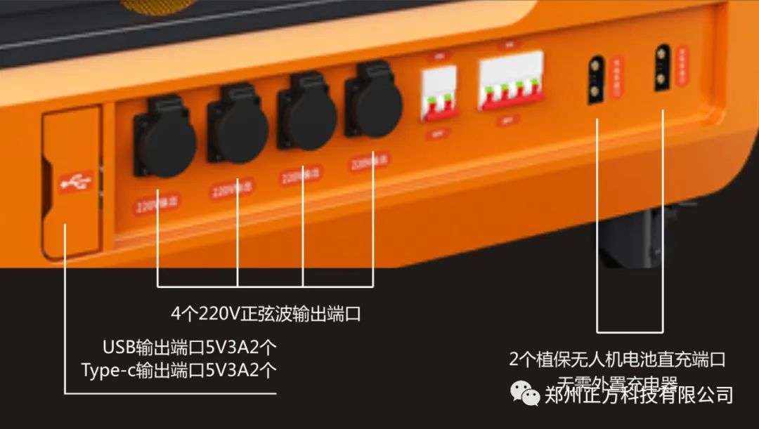 交流输出端口220V4个,可为植保无人机电池、电动工具、电动车、空调、生活电器等设备提供电源,满足植保专用和一般正常生活用电需求。