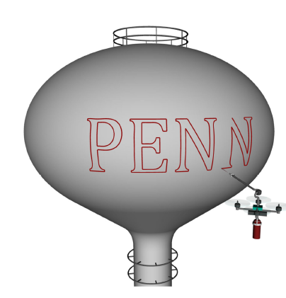 宾夕法尼亚大学设计的4轴无人机+2自由度机械臂可以实现末端的位置和姿态轨迹跟踪[3],用于高空喷涂(图3)和空中摄像(下面的视频)等。其中,空中摄影要求末端相机始终指向目标物,同时末端的相机始终处于水平平面上,不能有倾斜。这就要求系统必须规划出一条在构型空间动力学可行的路线,使末端具有6D轨迹跟踪的能力。但是这个仅仅是仿真,还没有做出实物实验。