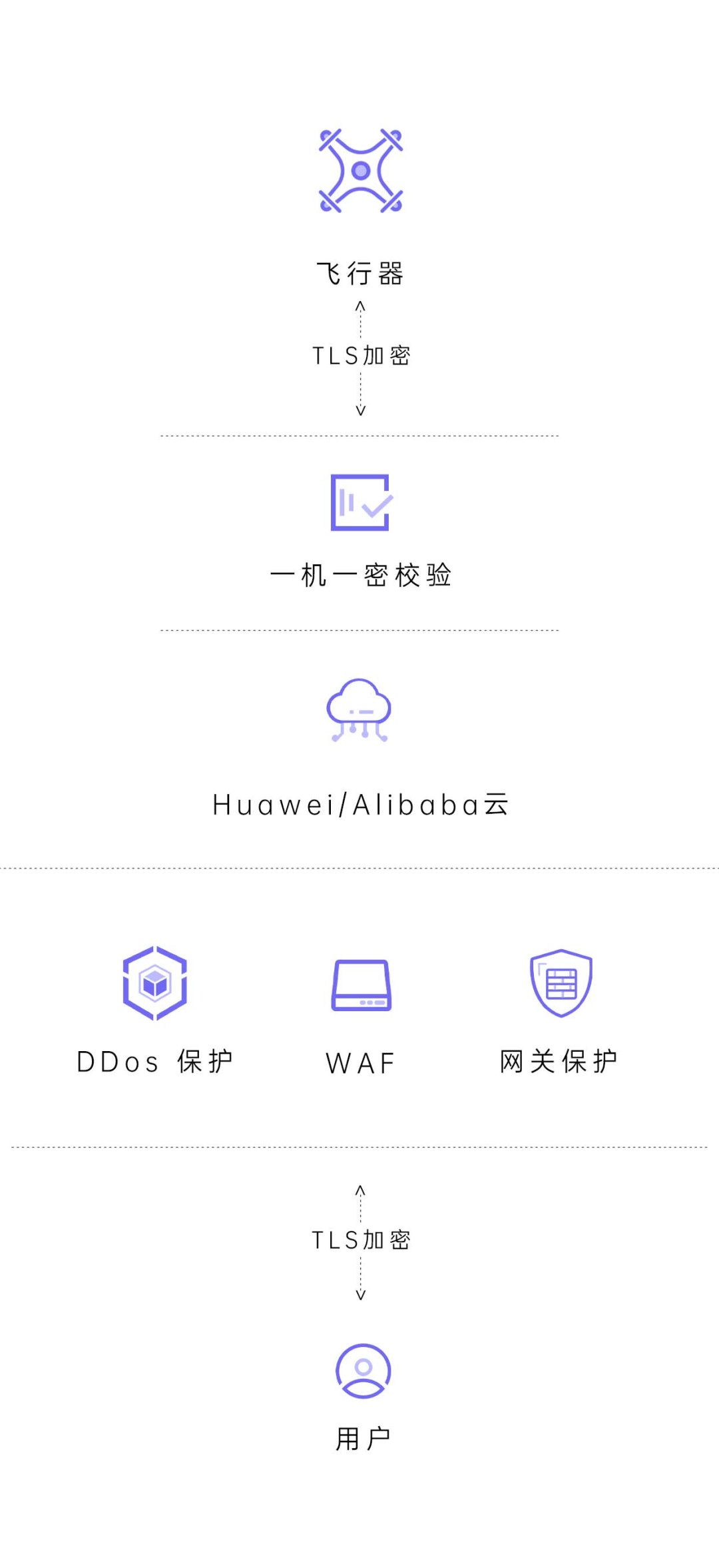 飞行器数据-传输通过一机一密校验,上云存储;平台读取数据预设入侵防御系统,网关保护,等多层安全加密传输,时刻护航用户数据安全,同时,平台全面支持国产化服务系统。