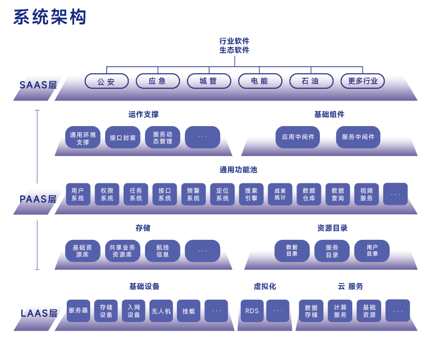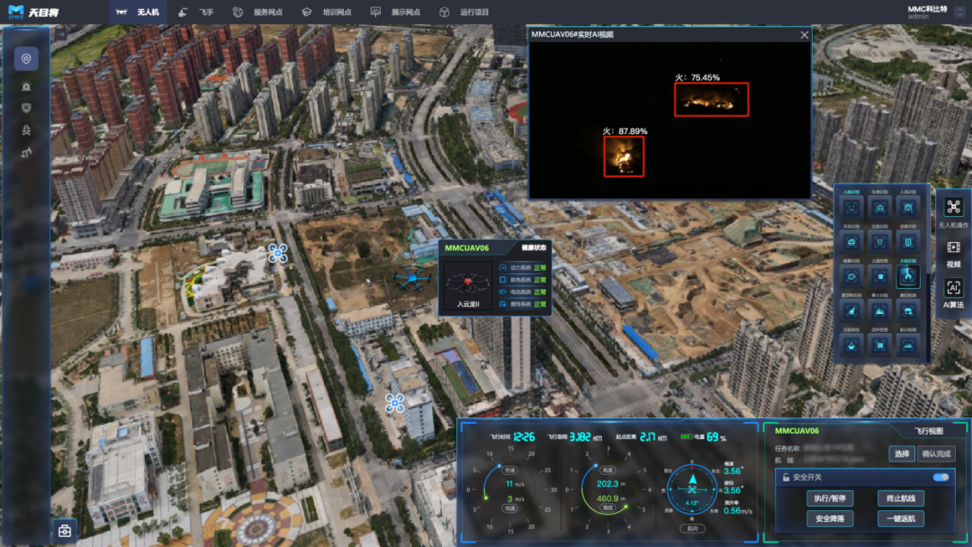 基于全球影像基础底图、AI智能算法、云计算服务,融合无人机行业应用系统,一站式解决飞行平台,前端操作人员,后端指挥中心的协同管理问题,同时具备地理信息语义、直播画面问题智能标注等多项数据成果云端处理、分析能力。
