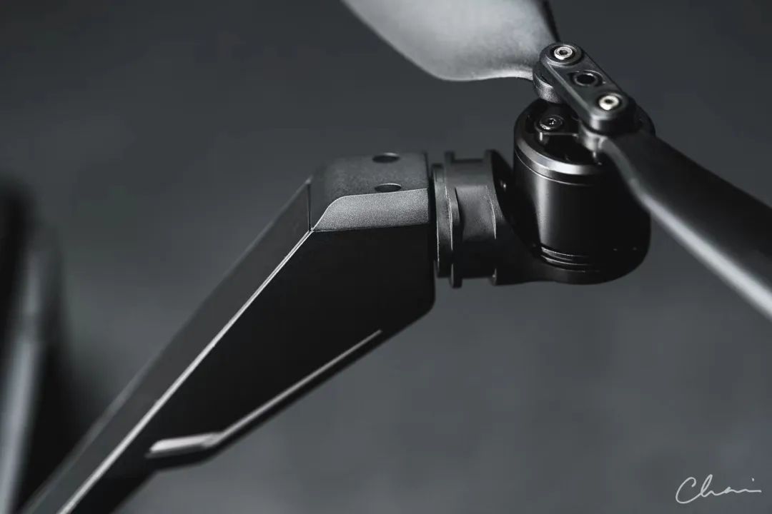 “设计理念与鱼鹰战机有点像,V字型设计,正面看像是头老鹰飞在天上。电机部分可以旋转,以此来控制桨叶朝向,从而前后飞行。由于电机只有2个,所以单次续航时间达到了惊人的50分钟。智能跟随,智能飞行之类的功能都有,避障功能有前方和下方,有3轴稳定摄像头。”