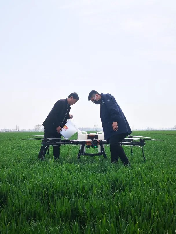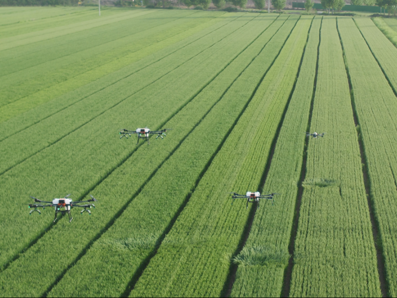 广阔的麦苗田地上空一架无人机发出“嗡嗡”鸣响,无人机正按照制定的航线进行飞行作业,为上百亩麦苗喷洒农药。