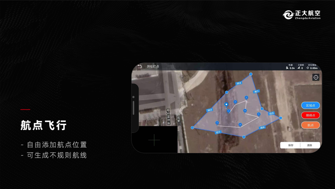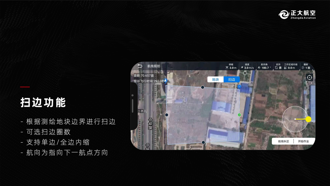 正大航空F60农业无人机,可以针对针对复杂的地形自动绕开障碍物,前后置双摄像头,配置夜视灯,可夜间作业,最高飞行可达30米,一般播种飞行高度控制在2.5到3米左右,飞行速度每秒约5米,载重能力达30公斤,结合MOPRO雷达矩阵,在喷洒和播撒方面实现高效作业,一小时可以播种90亩地,是人工效率的45倍左右。