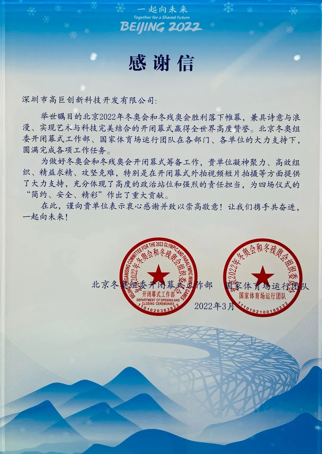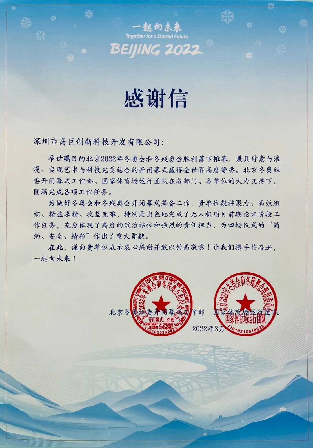 近日,北京冬奥组委开闭幕式工作部、国家体育场运行团队发来两封感谢信,表彰高巨团队助力冬奥赛事,在冬奥会的开闭幕式外拍视频短片拍摄及无人机项目前期论证阶段工作中作出了重大贡献。