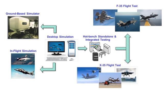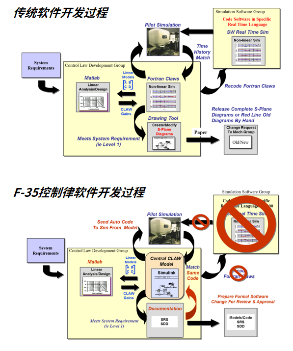 由于F-35控制律融合了非线性动态逆(NDI)控制结构,控制律工程师的工作发生了根本性的变化。与传统的控制律工程师相比,F-35的飞控团队不再专注于开发基于线性模型的增益调度。取而代之的是深度的参与到飞机的气动,与操稳工程师密切合作来开发机载模型,这成为飞控控制律的一个组成部分。为了简化飞控控制律软件开发过程,F-35团队还选择图形化实现、基于模型的飞控控制律开发方法,并使用MATLAB Autocode自动生成代码。