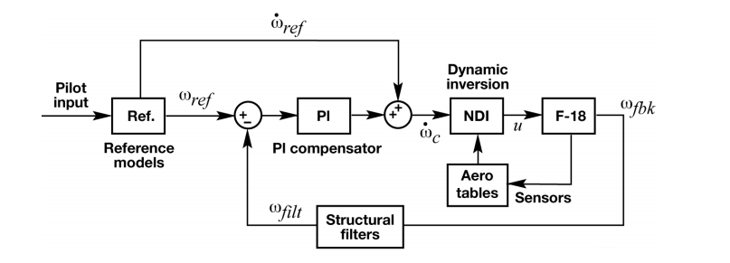 非线性动态逆/反馈线性化方法理论上非常简单,是基于对飞机动力学方程的理解来实现的。如果可以预测飞机对控制执行器输入的响应(比如飞机俯仰加速度对水平尾翼偏转的响应),那么就可以推导出所需的控制效应器输入以达到所需的飞机响应。这样可以通过消除飞机原来的动力学方程(动态逆)来定义所需的飞机响应。