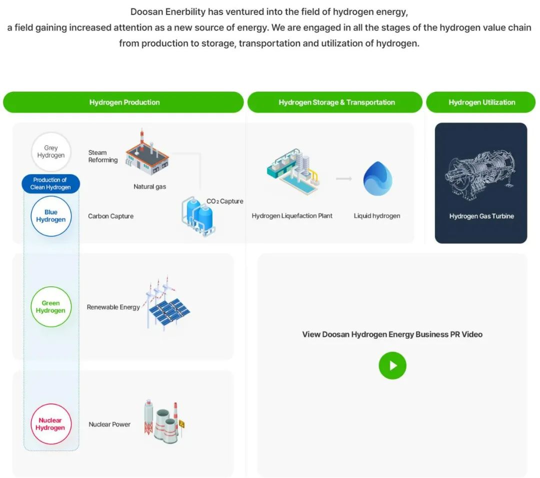随着全球氢能产业的发展及未来前景,斗山逐渐将各事业部门集中到氢能等新技术领域,包含绿色制氢,高压储氢,固定发电及移动用氢等领域。