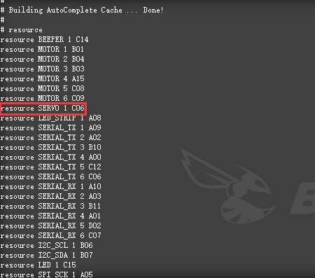 连接飞控,打开BF软件进入CLI命令行界面,输入resource,先找到可更改舵机的端口;