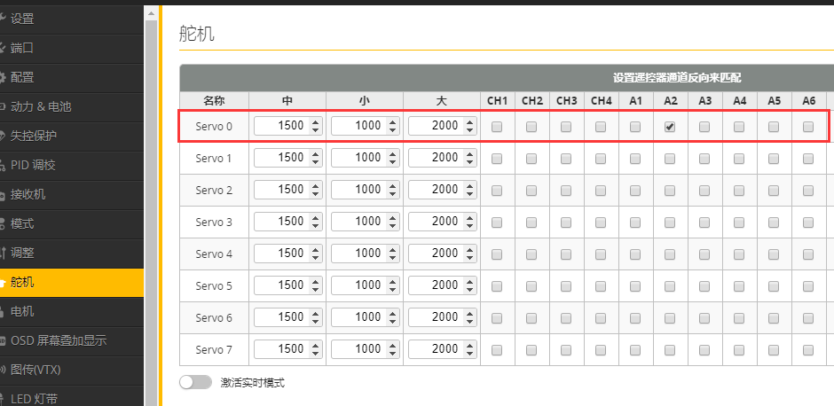 进入舵机界面,在SERVO 0选项勾选A2,这里的SERVO 0,就是对应刚才设置的SERVO 1,A2对应的就是AUX2通道,设置后点击保存。