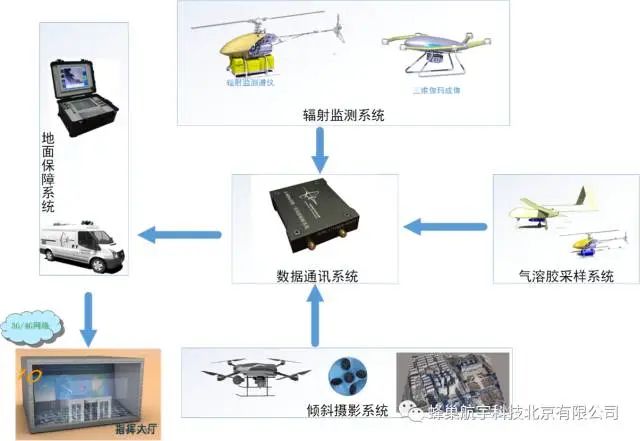蜂巢航宇无人机核检测系统无人机生成3D地形信息,无人直升机平台携核辐射监测谱仪、气溶胶采样器和伽玛相机对环境进行采样生成监测数据,固定翼完成高空大范围长航时监控,通过图数一体化通讯系统完成从空中到地面保障系统(包括地面站和地面测控车)的数据传输和初步处理,再通过4G/5G网络将数据传到地面指挥车,形成一套完整的核应急辐射侦检系统。
