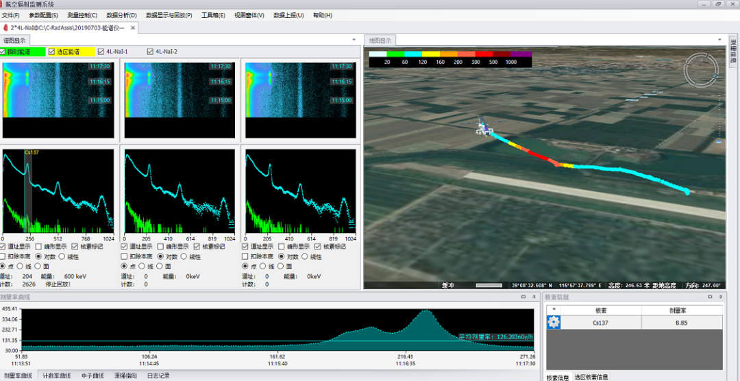 所有测量结果均可在GIS上实时显示,配套软件可支持多个探测器,测量结果可通过数传电台实时向地面指挥车传输,可通过软件控制谱仪状态,修改谱仪参数。