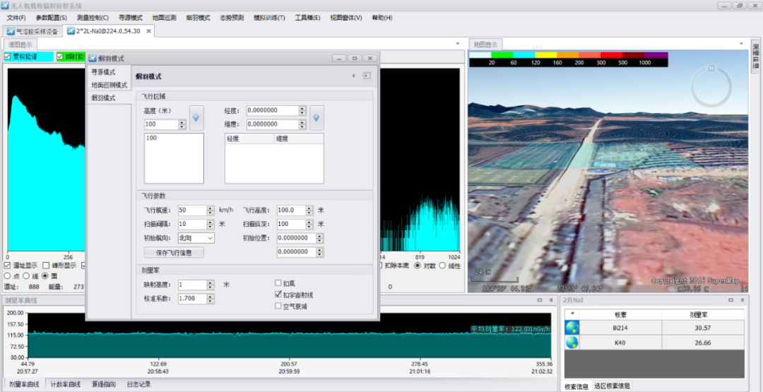 放射性航测软具有地面大面积污染巡测模式,能够将空中测量的γ剂量率等效到地面1.5m剂量率;