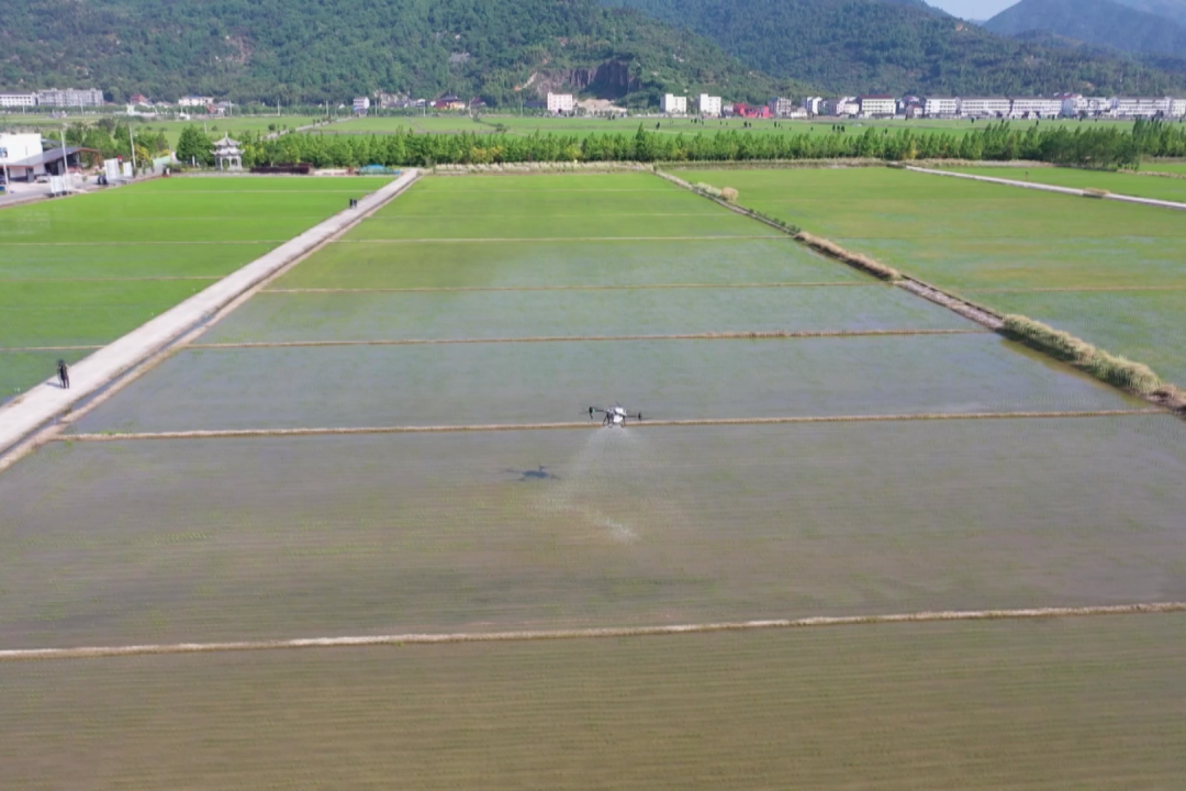 在天井垟粮食生产功能区,一台植保无人机正在进行“飞洒”作业,将化肥均匀地洒在水稻田里,一分钟左右就完成了一亩水稻的追肥作业。“一台植保无人机一天能完成约200亩农田的飞洒肥料作业,如果是飞洒除草、除虫的农药,一天能完成400多亩。”负责这一片区域植保的无人机机手潘洪德说。