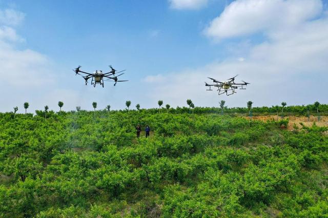 5月10日,枣阳市熊集镇茶庵村彭冲七组,湖北霖森农林开发有限公司桃子产业基地正在利用植保无人机喷洒农药进行飞防管理。与传统的人工喷药相比,使用无人机对山岗桃园实施飞防效率高、成本低、节药省水,原来需要十多人的团队,现在仅需两人即可轻松完成。湖北日报客户端通讯员申学强 钟华摄
