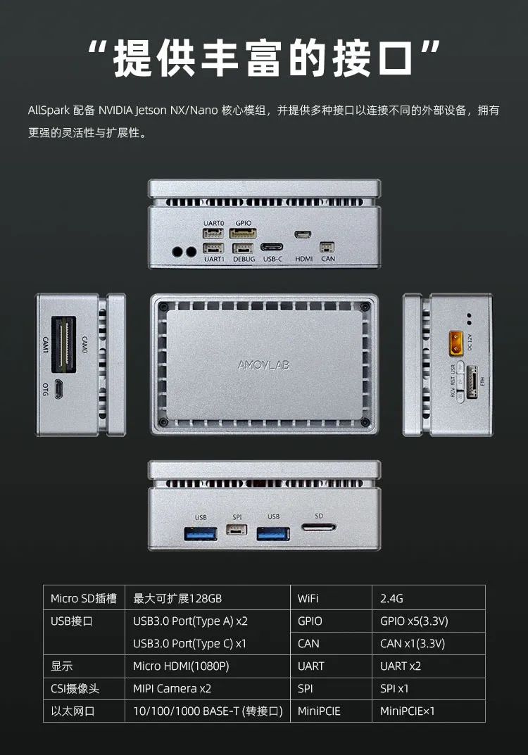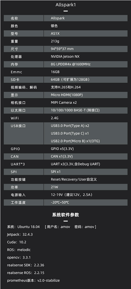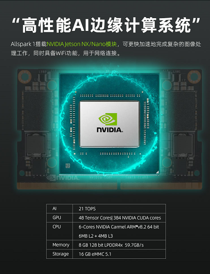 Allspark基于NVIDIA Jetson NX平台开发,内存8G LPDDR4x @1600MHz,Emmc 16GB,SD卡64GB(最大可支持128G),计算能力比市面上最新一代苹果M1 Ultra处理器更强,最高支持21 TOPs的AI计算能力,扩展接口包含CANSPIUARTHDMIUSBGPIOMIPI等。详细配置表如下: