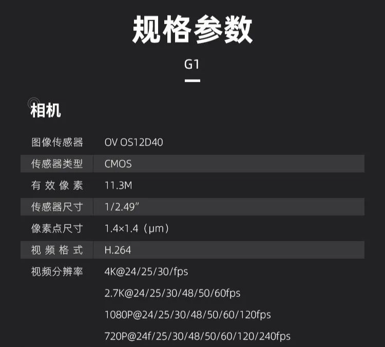 同时,采用的OV OS12D40彩色图像传感器,是一种高性能的CMOS 1/2.49”图像传感器,最高能以60fps的速度提供1130万像素(4512x2512)的图像信号。像素点为1.404μm x 1.404μm ,最高可支持4K@30fps视频拍摄。
