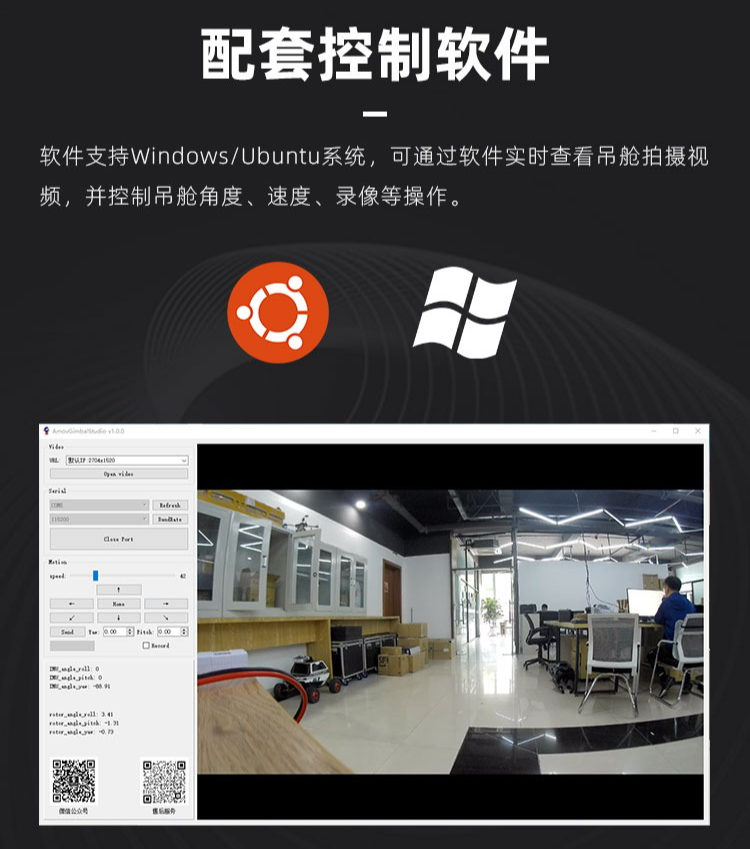 阿木实验室G1吊舱为提高二次开发效率,搭配了稳定可靠的控制软件Amov Gimbal Studio,支持Windows和Ubuntu双系统。