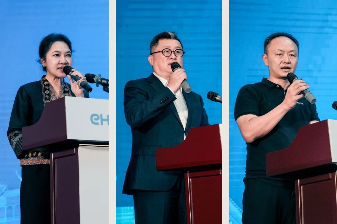 从左至右为泰王国驻广州总领事馆总领事吉拉蓬·素妲尼、正大集团副总裁李闻海、亿航智能首席运营官方鑫在签约仪式现场发表讲话