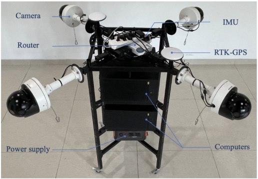 全景视觉网络系统由一个中心节点和大量感知节点组成,如图1所示,黄色框表示感知节点,蓝色框表示中心节点,红色框表示目标无人机。图2展示了感知节点的组成,可以看到,每个感知节点由4个相机组成,每个相机由4个镜头组成,所以,每个感知节点共有16个镜头。除此之外,感知节点中还包含了一些其它装置,如用于确定节点坐标系的RTK-GPS和IMU,用于与中心节点通信的路由器、用于处理数据的两台计算机(每台计算机处理4组双目数据)等。中心节点由计算机和路由器组成,用于接收并融合各感知节点获得的目标无人机的空间位置,然后给出最终的目标无人机数量以及它们各自的空间坐标。