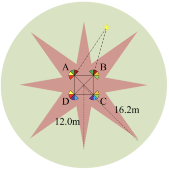 在感知节点中,我们使用双目视觉定位技术估计节点与目标无人机之间的距离。感知节点中的16个镜头两两为一组,组成了8组双目,在图3中用相同的颜色表示一组双目。值得注意的是,由于双目镜头的配置,各个感知节点存在部分视野盲区,见图3中的红色区域。当目标进入视野盲区的时候,感知节点将无法准确定位目标无人机,但是由于系统中存在大量的感知节点,此时可以依靠周围的感知节点实现对目标无人机的准确定位。因此,各个感知节点具备360°全景检测和定位目标无人机的能力。相比于商业版的双目相机,我们的这套系统拥有更大的基线(1 m),所以可以估计更远的目标距离。