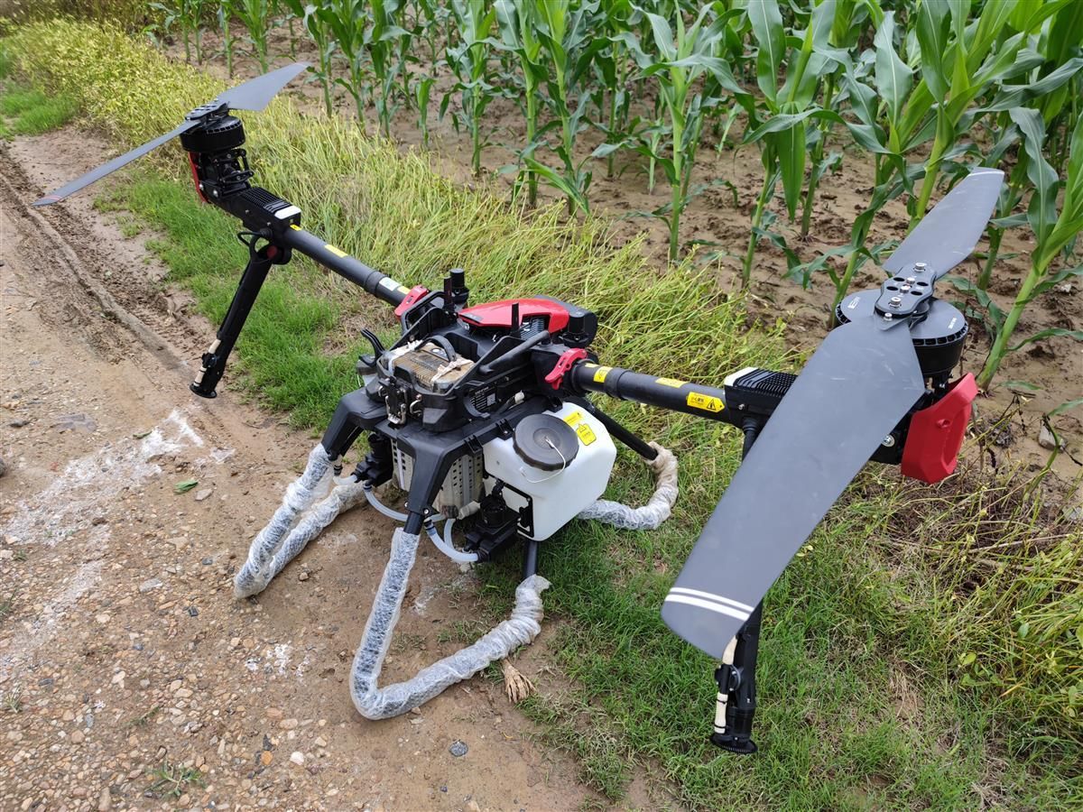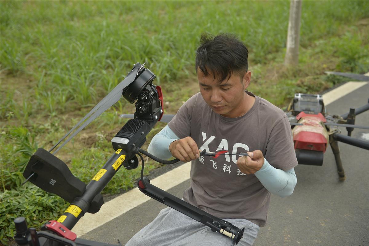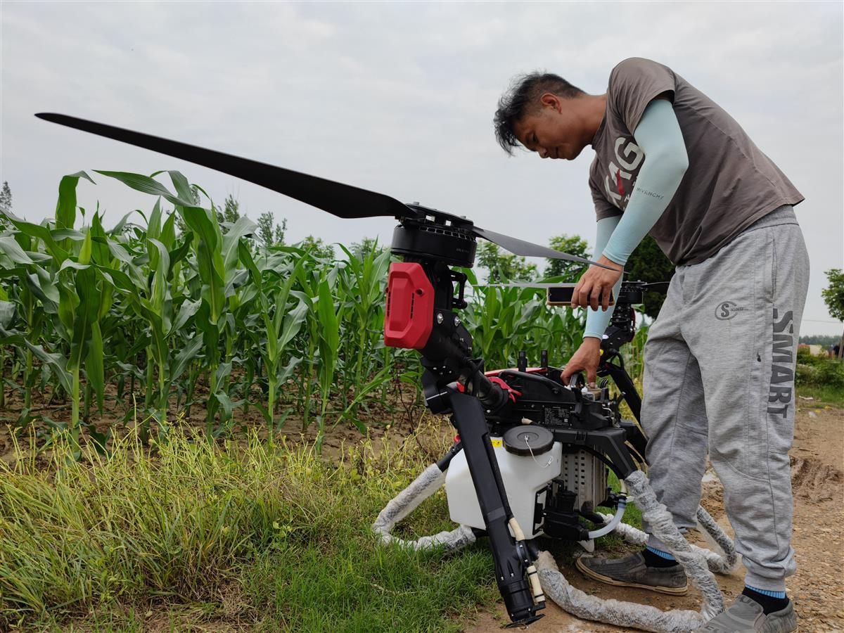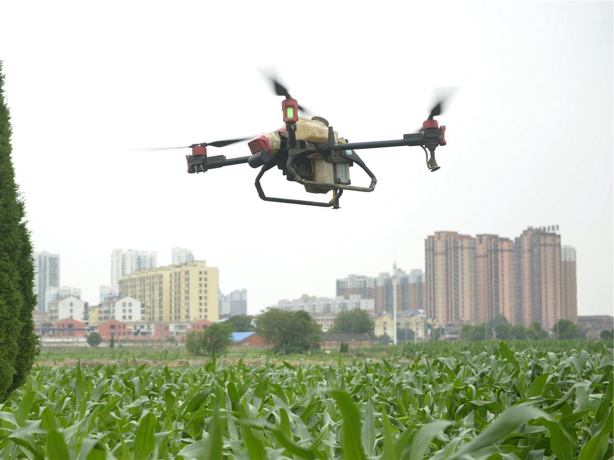 6月5日,云梦县鑫盛蔬菜种植专业合作社组织的农业植保无人机升空作业,对合作社玉米地病虫害进行防治并喷洒营养液叶面肥。