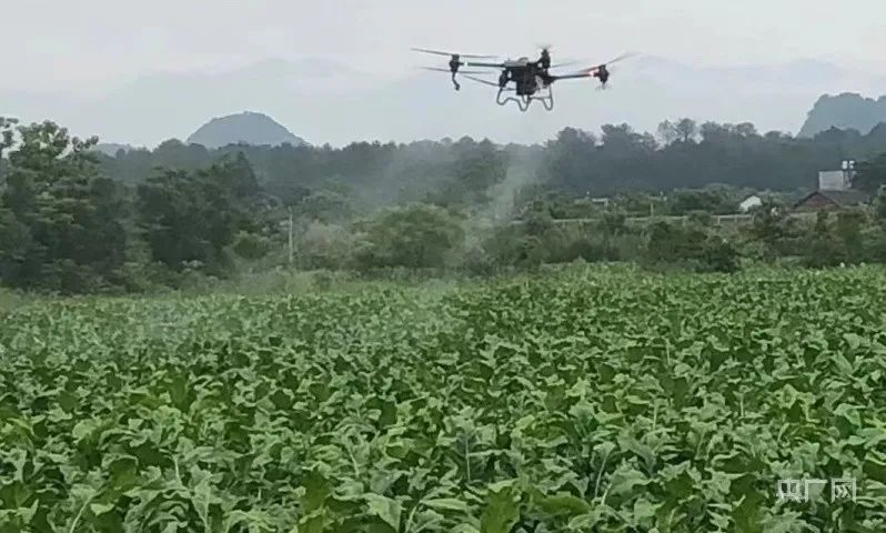 植保无人机正在烤烟种植基地喷洒杀虫药液(央广网发 通讯员供图)