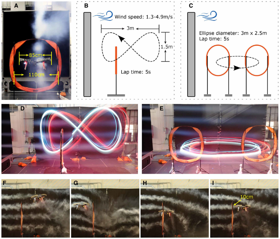 未建模且日益复杂的空气动力学是精确飞行控制最显著的挑战之一。在多风环境中飞行(如图1所示),由于无人机、诱导气流和风之间的不稳定空气动力相互作用,导致更加复杂(烟雾可视化见图1F)。这些非定常和非线性气动效应极大地降低了常规无人机控制方法的性能,而这些方法在控制设计中忽略了它们。