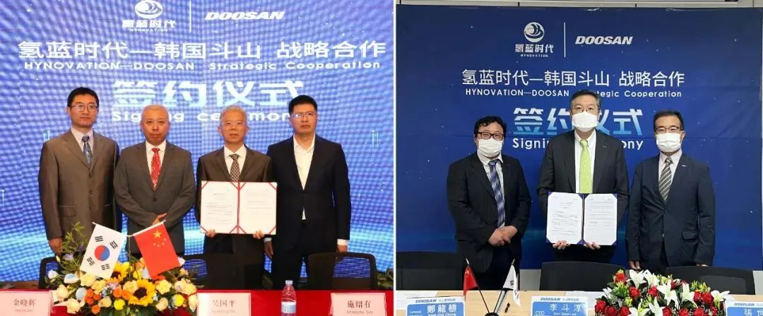 约仪式上,斗山创新CEO李斗淳,氢蓝时代高级副总裁吴国平分别代表双方签署了战略合作协议,双方高管见证签约仪式。