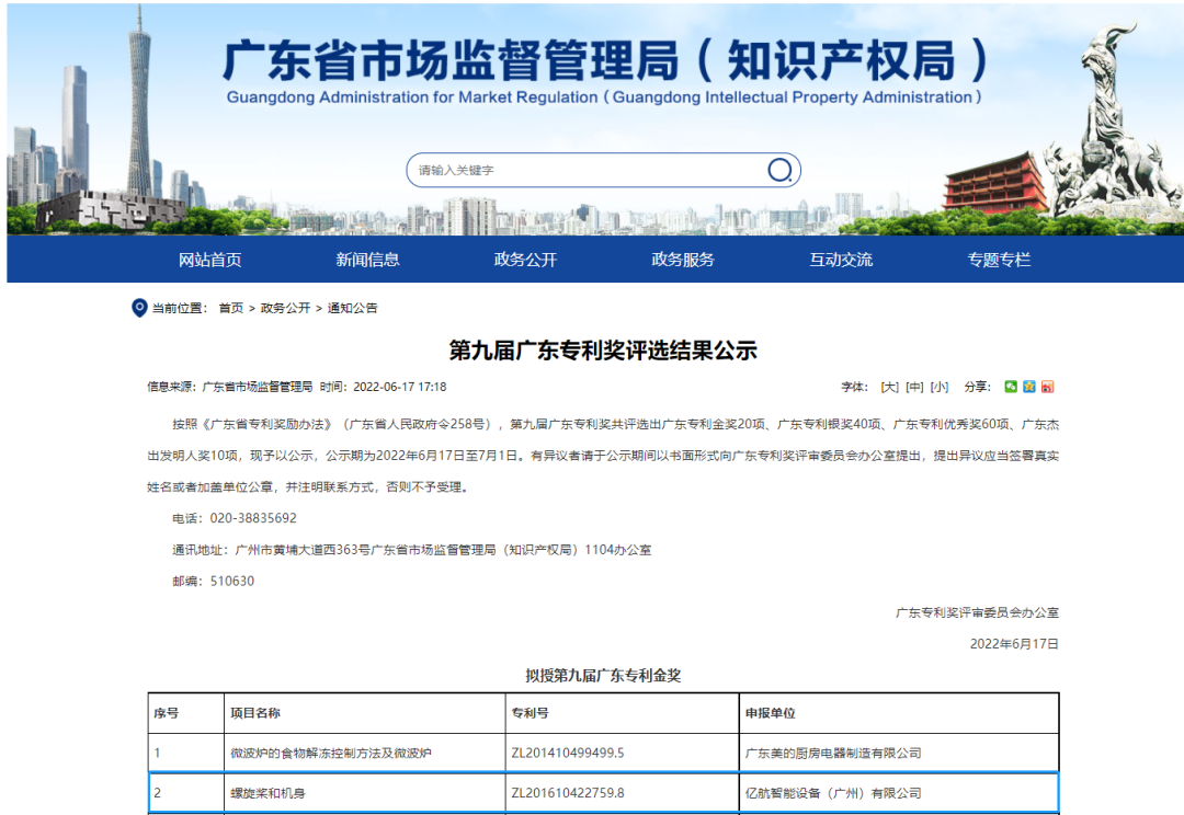 根据《广东省专利奖励办法》共设置广东专利金奖、广东专利银奖、广东专利优秀奖、广东杰出发明人奖四类奖项。广东专利金奖是广东省专利领域最高级别奖项,本届全省只有20项专利获此殊荣。本次亿航智能获得金奖的是“螺旋桨和机身”项目(专利号:ZL201610422759.8)。亿航智能自动驾驶飞行器机身采用流线型设计,兼具美感与实用价值,螺旋桨和机身使用三种轻量化材料的创新复合结构,大大减轻螺旋桨和机身的重量,同时兼顾结构强度,有效增强自动驾驶飞行器的续航能力。