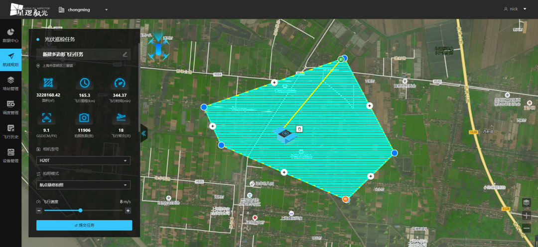 首先,在对星逻驭光软件进行演示时,星逻工程师以分布式屋顶光伏作为场景进行操作,展现了星逻驭光作为一款与无人机机库解耦的独立软件的优势。员工通过多样化的管理终端实现了无人机的远程管理,只需点击屏幕中的相应点位,即可完成多航线的任务规划和一键起飞,效率相比于人力提升10倍。