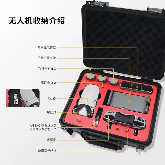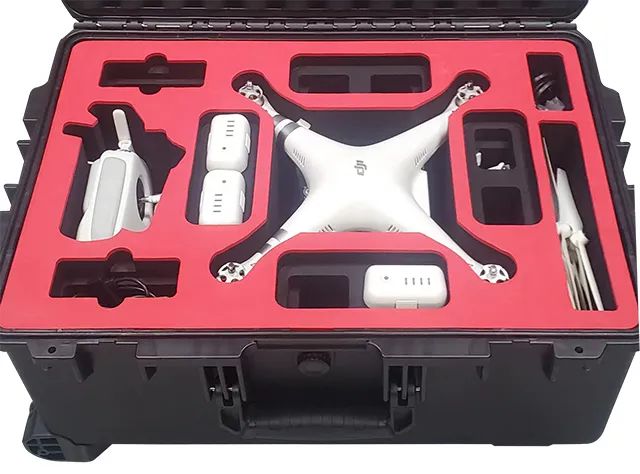 >箱子内部可以根据无人机及配件的尺寸个性化定制环保EVA材质内衬,从而为无人机提供更强的防护性;
