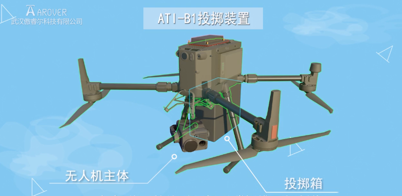 武汉傲睿尔科技有限公司研制ATI-B1机载智能识别与投掷装置,基于人工智能算法技术实现实时图像分割、目标检测及定位等功能,可自主识别、跟踪飞行至目标区域上空实施精准投掷,可广泛应用于各种应急抢险、野外救援场景。